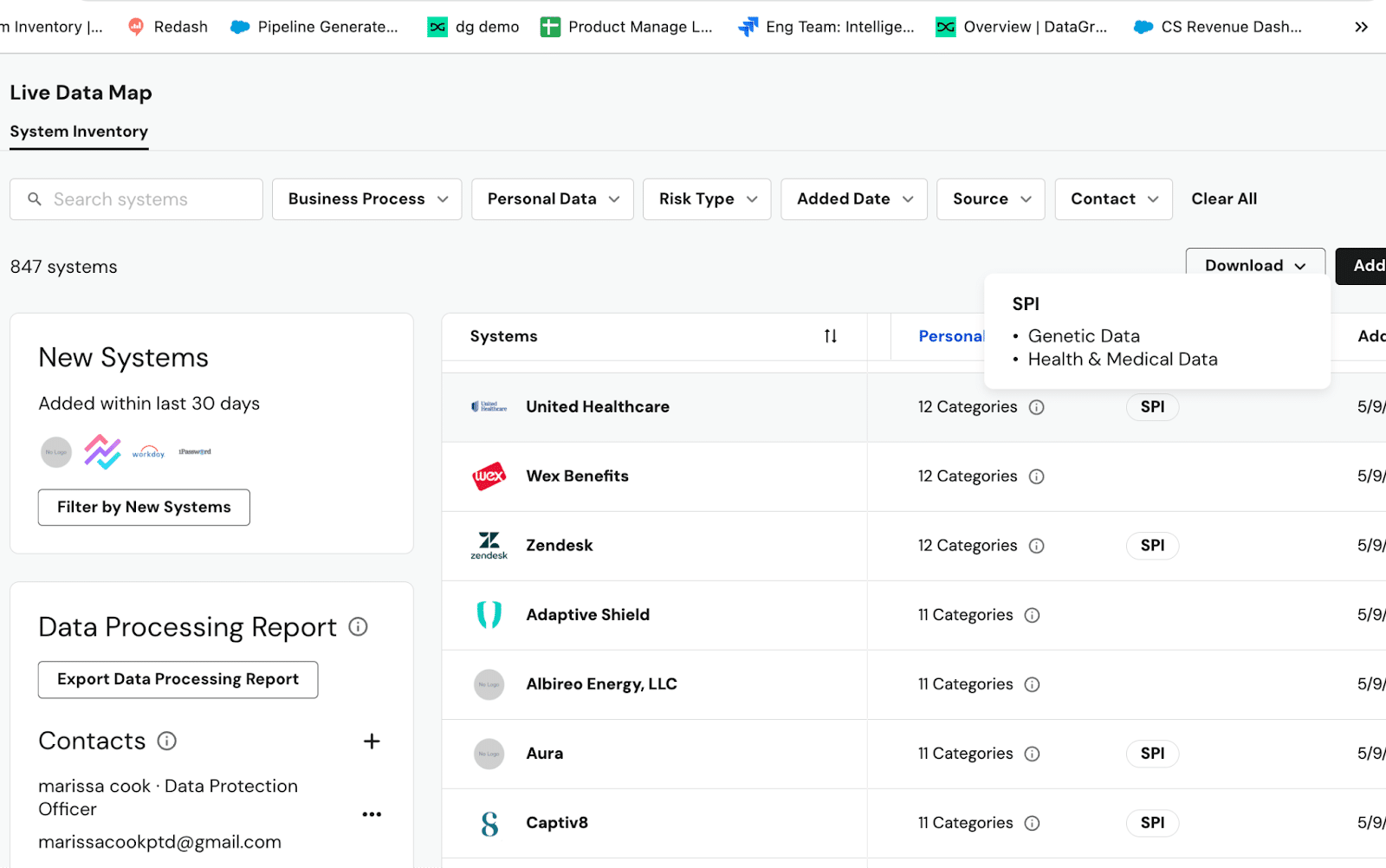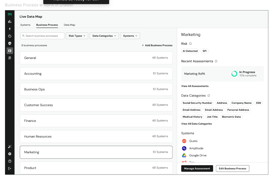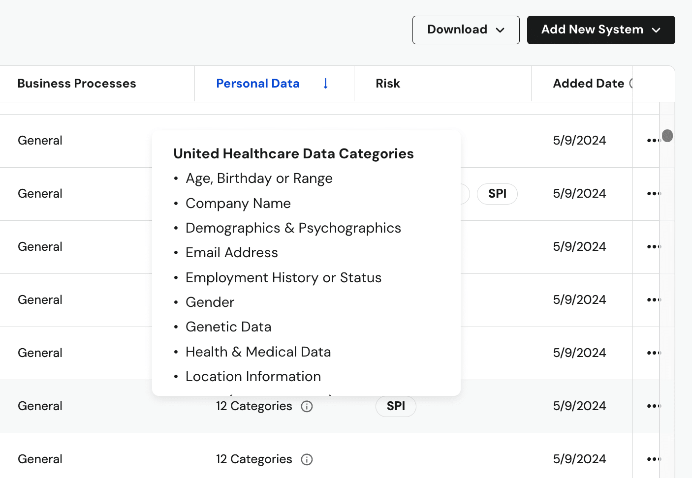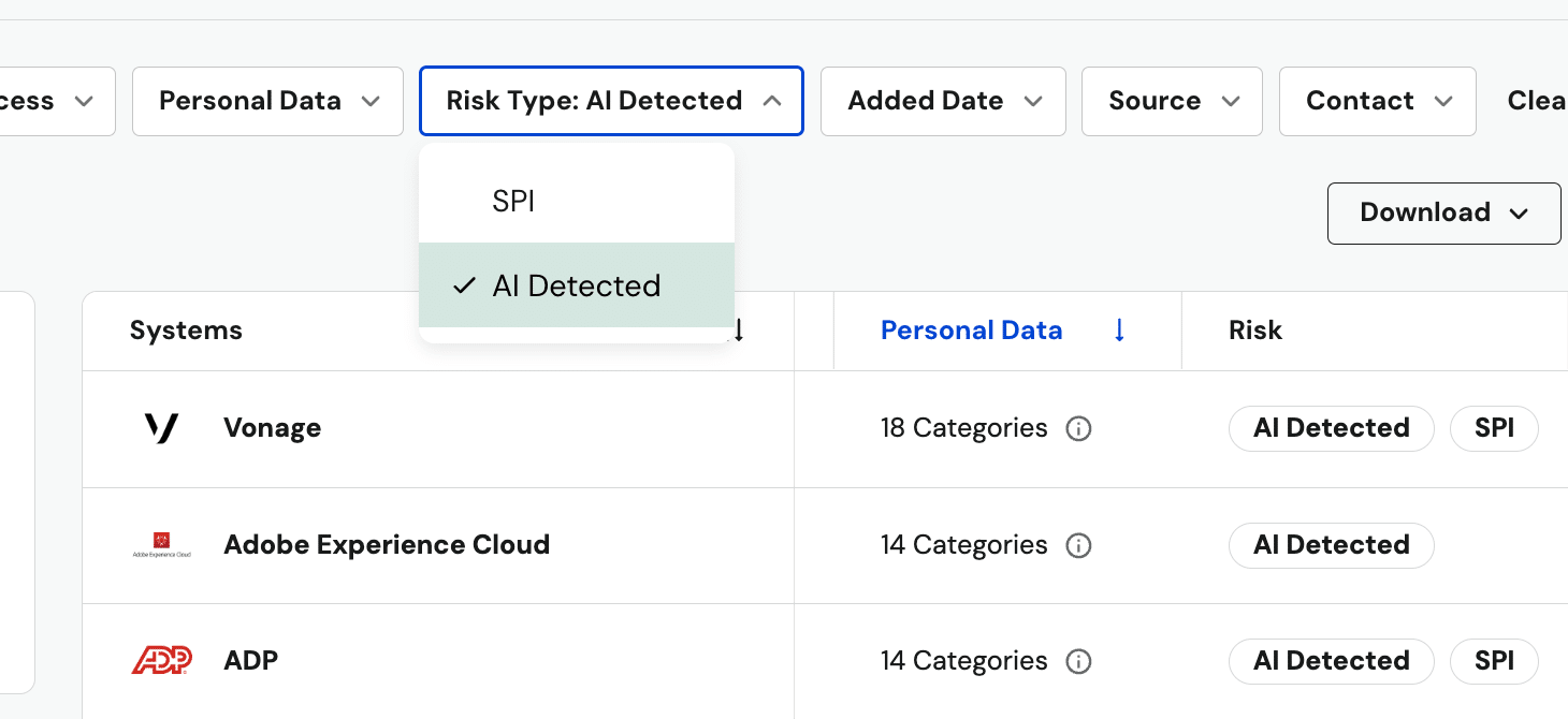Now, the Risk Column will flag systems likely to process Sensitive Personal Information (SPI), such as healthcare data or Social Security numbers, as well as systems likely to involve AI usage.