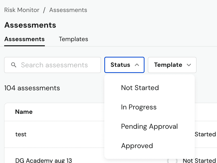 Managing a high volume of assessments just got easier. With our latest update, customers can now search for assessments by name, or filter by status and template type in Risk Monitor, giving you more control over how you organize and sort through your assessments.