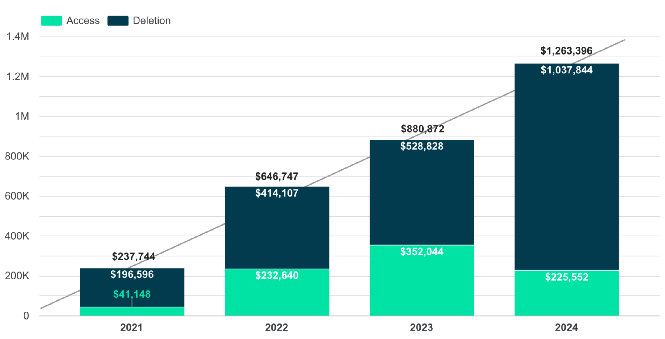 DSR management costs rose 43% YoY in 2024, driven by a surge in deletion requests, which now make up 82% of all DSRs.